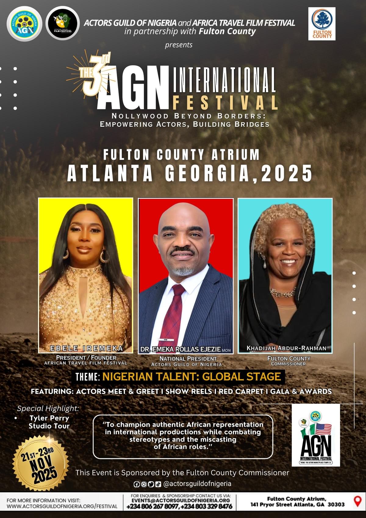 AGN International Festival and African Travel Film Festival in partnership with Fulton County is gearing up for the festival's 3rd edition; a celebration of the brightest and the best of Nigerian films and television actors, and will feature a wide range of events, including a red carpet gala and awards, film screenings, panel discussions, city tours, workshops and seminars, where actors, filmmakers, and other creative professionals can network and learn from each other - as well as meet and engage with their fans and supporters in the diaspora.